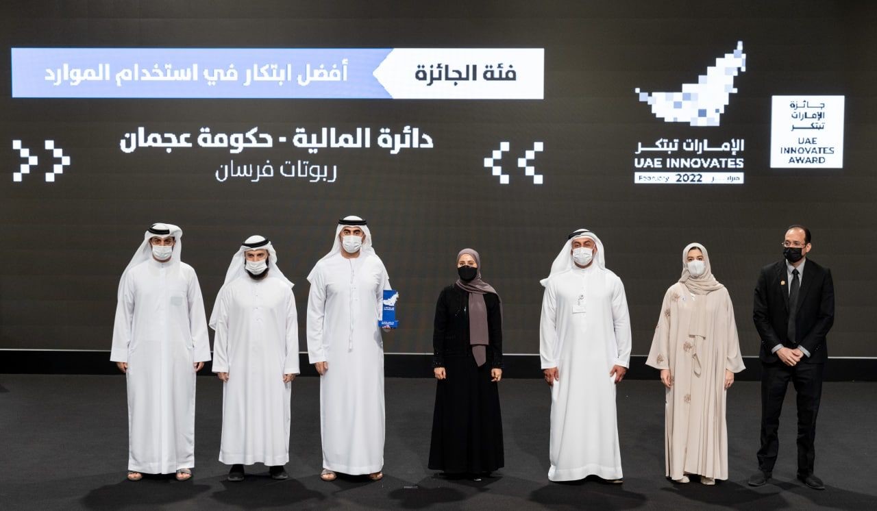 دائرة المالية في حكومة عجمان تفوز بجائزة “الإمارات تبتكر2022 ” ضمن فئة أفضل ابتكار في استخدام الموارد في ”مشروع روبوتات فرسان” ضمن 460 مبادرة ومشروعاً مشارك في فعاليات الدورة الثانية من الجائزة، وسلمت معالي عهود بنت خلفان الرومي وزيرة دولة للتطوير الحكومي والمستقبل، درع الجائزة إلى سعادة مروان أحمد آل علي مدير عام دائرة المالية، خلال حفل جائزة الإمارات تبتكر والذي أقيم في متحف المستقبل بدبي.