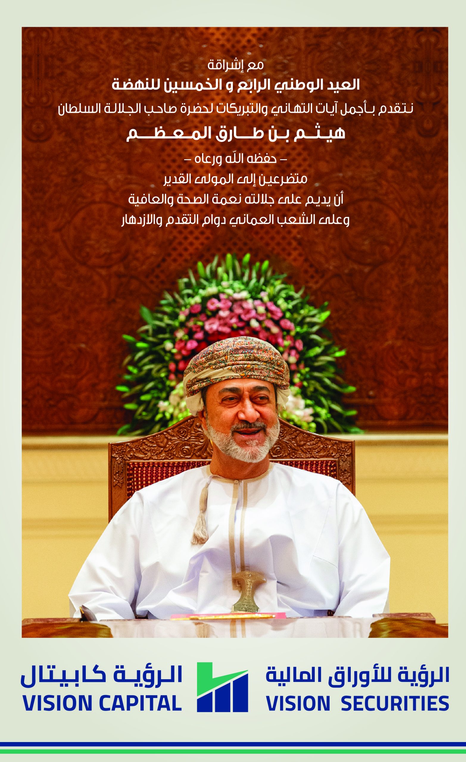 مع إشراقة العيد الوطني الـ 54 المجيد للنهضة تتقدم الرُؤية للأوراق المالية والرُؤية كابتال بأجمل التهاني والتبريكات لحضرة صاحب الجلالة السلطان هيثم بن طارق المعظم حفظه الله ورعاه متضرعين إلى المولى القدير أن يُديم على جلالته نعمة الصحة والعافية وعلى الشعب العُماني دوام التقدم والازدهار